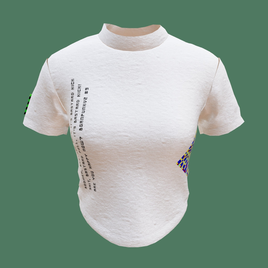 GLIX BGANS ホワイト クロップトップ ベビーT。反骨精神あふれるグラフィックがサイバーパンクのエネルギーを脈打つ。デジタルアンダーワールドで生きる者たちのためにデザインされた、現実世界と仮想世界の両方で大胆な主張を放つ定番アイテム。